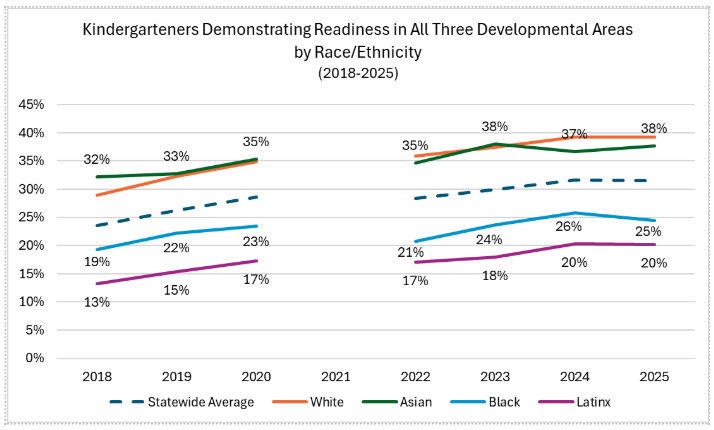 Although there were no major shifts this past year, the data continues to reveal disparities in kindergarten readiness across demographic groups.