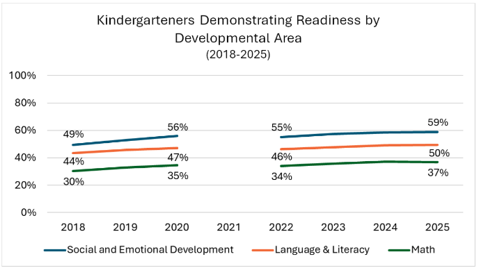 In SY24-25, 31.5% of kindergartners demonstrated readiness in all three developmental areas, holding fairly steady to the prior year and contributing to an arc of steady growth over the 7-year stretch (with the exception of SY21, that was impacted by the pandemic). More youngsters demonstrated readiness for kindergarten in social & emotional development, while just under half were ready in language and literacy development, and just over one-third were on track for math development.
